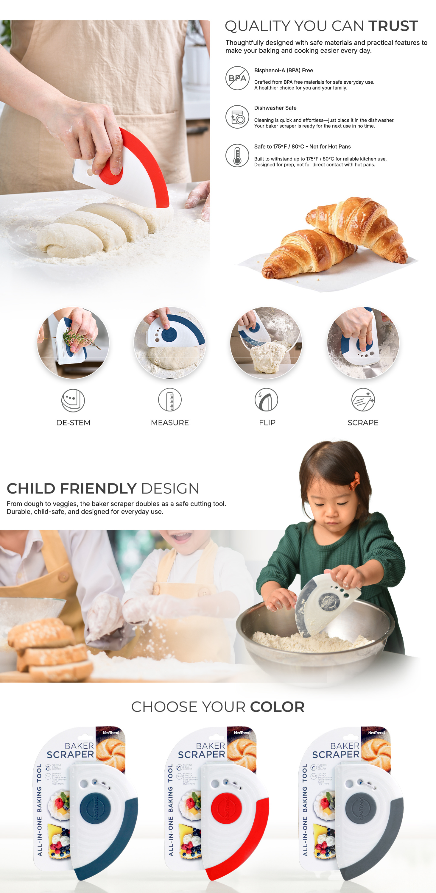 Born from the belief that baking tools should be simple, useful, and beautiful. The BakerScraper combines five tools into one sleek, space-saving design.